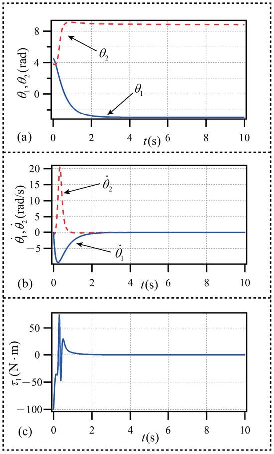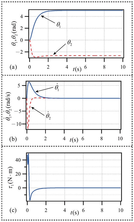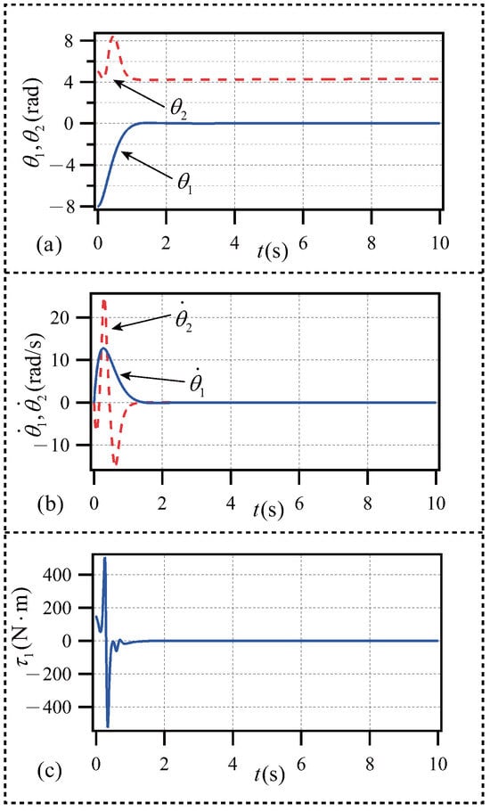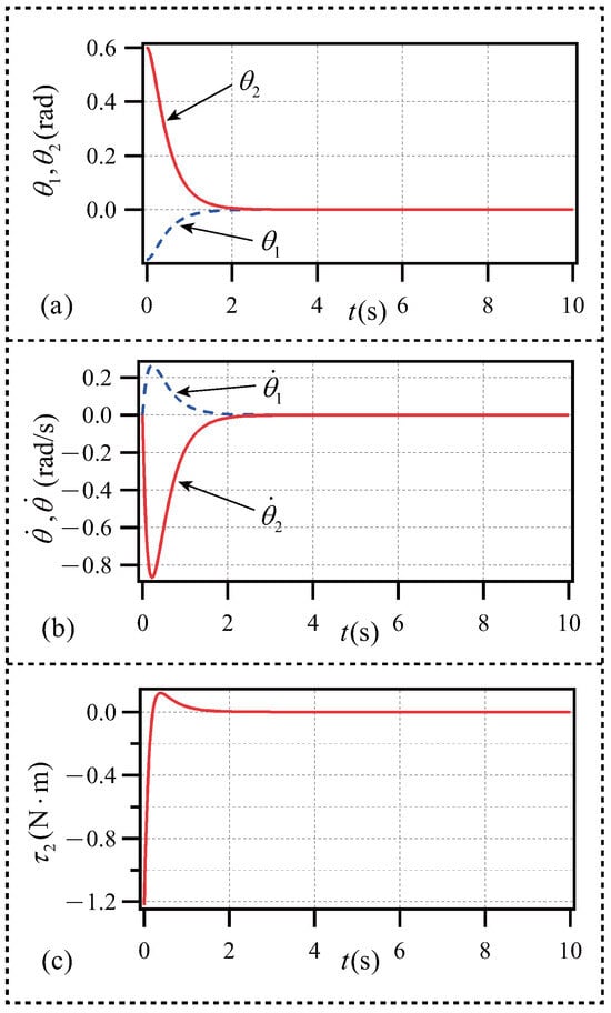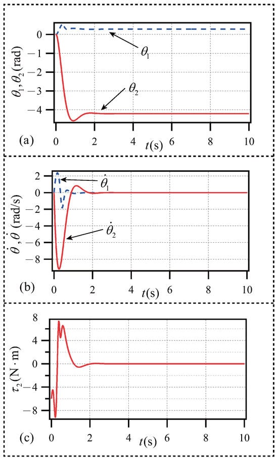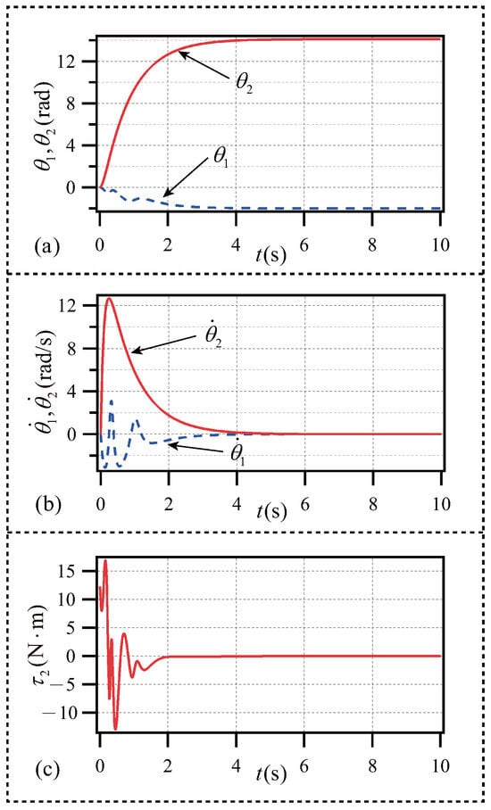 As shown in Figure 6a,b, both the angle and angular velocity of the two links converge steadily from the initial state set by Equation (26) to the target state. Figure 6c shows the torque variation of the second actuated link. The final results indicate that the control method successfully converges to the target state within t = 3 s, the angular velocity range is rad/s, and the range of torque is maintained at . The control goal can still be achieved.