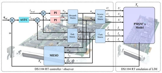 Here, and denote the d-q axis stator voltages, while and represent the corresponding currents, with and indicating the respective inductances in the rotor reference frame. This paper focuses on surface-mounted PMSMs, where Ld = Lq = L. The other system parameters include the following: (stator resistance), (permanent magnet flux linkage), ωe and ωm (electrical and mechanical angular velocities), and (electromagnetic and load torques), (moment of inertia), (number of pole pairs), and (viscous friction coefficient).