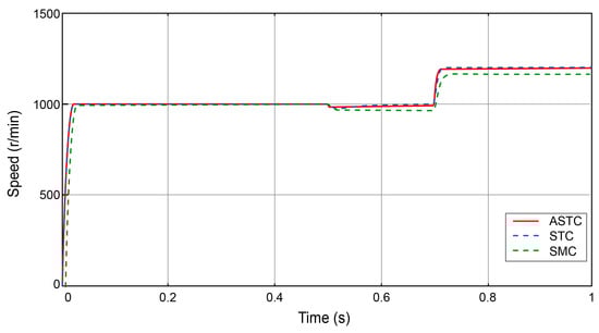 We conducted a speed tracking experiment, which involved maintaining a constant speed followed by a transition to variable-speed conditions in the PMSM. This experiment aimed to verify the proposed control strategy’s effectiveness in speed regulation and its capability to suppress oscillations. The simulation parameters were set as follows: a duration of 1 s and a sampling time of 1 × 10−6 s. In Case 1, the system’s target speed was established at 1000 rpm, starting without load. At 0.5 s, a sudden torque of 20 N·m was applied, and at 0.7 s, the speed was abruptly changed to 1200 rpm. Figure 3 illustrates the speed response under different control methods.