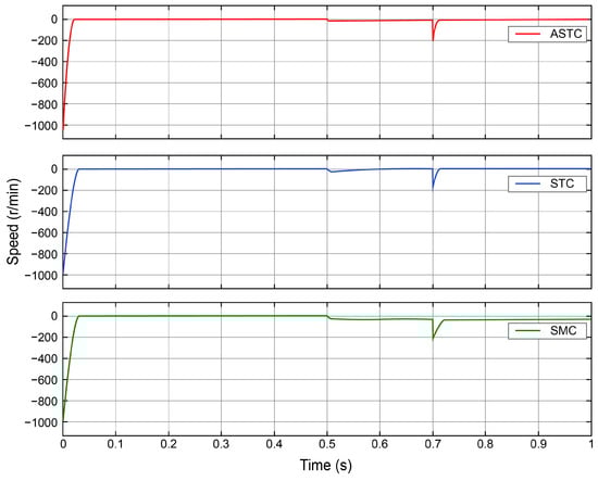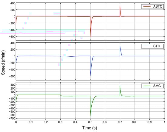 Compared to traditional STC and SMC, the designed control method significantly enhances system response speed while maintaining output precision. It enables rapid convergence, even under sudden acceleration, displaying superior speed regulation performance and improving the dynamic quality and disturbance rejection capability of the PMSM speed control system. By implementing ASTC, the system’s disturbance rejection capability is substantially enhanced. The proposed strategy, in comparison with traditional STC and SMC, adjusts itself in the face of disturbances, avoiding significant fluctuations and loss of control, with minimal disturbance impact. The oscillations typical of sliding mode approaches, generally indicated as tracking errors in system speed, are shown in Figure 4. Despite external load torque disturbances and parameter uncertainties, the speed tracking error exhibits rapid convergence, effectively mitigating the oscillations.