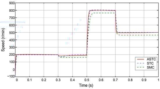 In Case 2, the system’s target speed was initially set at 200 rpm, with no load at 0 s. At 0.3 s, a sudden torque of 20 N·m was applied while maintaining the speed at 200 rpm. At 0.5 s, the speed increased to 800 rpm. Finally, at 0.7 s, the speed decreased to 500 rpm. Figure 5 illustrates the speed response under different control methods for this scenario. Figure 5 illustrates the speed response under different control methods in Case 2, the ASTC demonstrates superior response performance in both acceleration and deceleration scenarios. Similarly, Tracking errors have the same case from Figure 6.