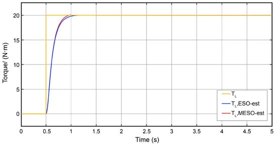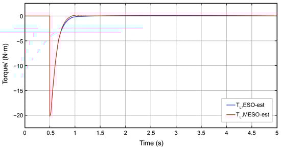 In this section, simulations of the load torque ESO and MESO are carried out for verifying the performance of the observer. The MESO’s observer bandwidth and disturbance compensation gain were calibrated via pole placement to achieve a trade-off between rapid disturbance estimation and noise amplification. A higher observer bandwidth improves disturbance rejection but risks amplifying high-frequency sensor noise. The observer gain, , and observer parameters, , were set. A step load of 20 N·m was applied at 0.5 s during a no-load start condition.All initial conditions for the load torque observer were set to zero.