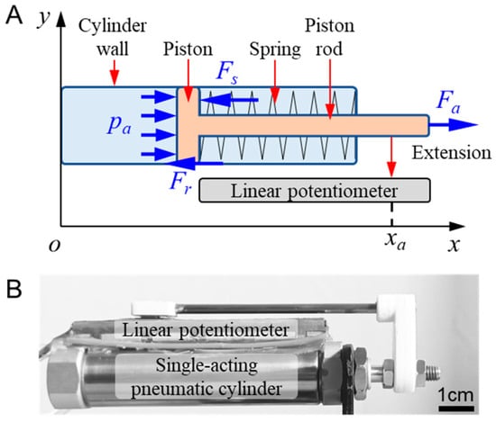 where and denote the actuating pressure and piston area, respectively, and and denote the restoring force of the spring and the friction between the piston and cylinder wall, respectively. For a standard single-acting pneumatic cylinder, its internal spring is generally designed to be in a compressed state to yield preload . Therefore, the restoring force of the spring can be given as