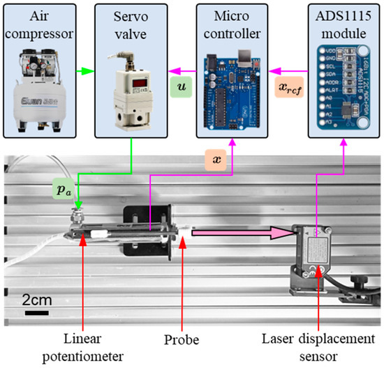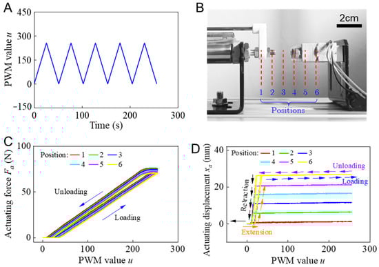 To support the subsequent modeling, a micro linear potentiometer (Changzhou Kunhang Robot Technology Co., Ltd, Changzhou, China) with a nominal resistance of 10 kΩ and a measurement range of 60 mm is used to measure actuating displacement , as shown in Figure 1B. An experimental calibration is performed to enhance the measurement accuracy of the linear potentiometer using the Bezier Calibration Method (BCM) [27], which is characterized by its accuracy and rapidity in real-time measurements.