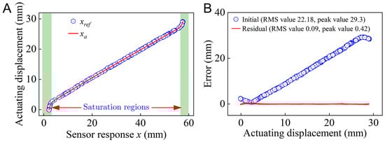 The measured reference value with respect to is displayed in Figure 3A. It reveals that due to the inherent nonlinearity, the linear potentiometer exhibits two saturation regions at the two sides of the measurement range. Through the BCM, the calibrated measurement results of linear potentiometer are compared with the reference value shown in Figure 3A. The corresponding measurement errors are computed and shown in Figure 3B. The results reveal that through the BCM calibration, the RMS value of the initial measurement error could be reduced to approximately 0.09 mm, with a reduction of approximately 99.6%. This level of error reduction essentially fulfills the requirements for subsequent modeling and control.