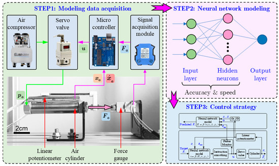 As described above, due to the nonlinear unknown factors, theoretical control modeling is quite difficult in practical control applications. The neural network method is more appropriate for nonlinear and complex modeling problems. The overall modeling procedure for the actuating force of the single-acting pneumatic system is depicted in Figure 4, which is mainly composed of three steps: