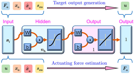 Figure 9 reveals that the modeling accuracy of and reaches their limit levels when the number of the hidden neurons increases to 5 and 7, respectively. The computing cost increases almost linearly with respect to the increment in the number of hidden neurons. Taking into consideration the balance between computing cost and modeling accuracy, the number of hidden neurons for the neural network models of and is determined to be 5 and 7, respectively. These configurations can be executed on a microcontroller within 2 ms, thereby fulfilling the real-time requirement for actuating force control.