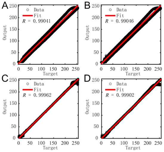 Modeling accuracy of the self-sensing model of the actuating force under different input layers. The horizontal and vertical coordinates represent the input and output values, respectively, of the target voltage instruction modeling data. The black line denotes the actual data distribution, and the red line represents the fit to the data. (A) Input layer ; (B) Input layer ; (C) Input layer ; (D) Input layer .