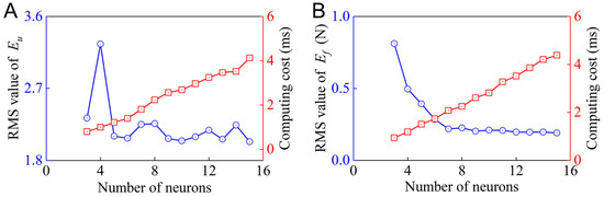 Generally, a higher dimension of the hidden layer can improve the modeling accuracy but also increase the real-time computing cost. Therefore, a balance between the computing cost and modeling accuracy is required. According to the designed input layer of the neural network model, the modeling accuracy and real-time computing speed are evaluated under different numbers of hidden neurons. The modeling accuracy of and are characterized by the Root-Mean-Square (RMS) value of and , respectively.