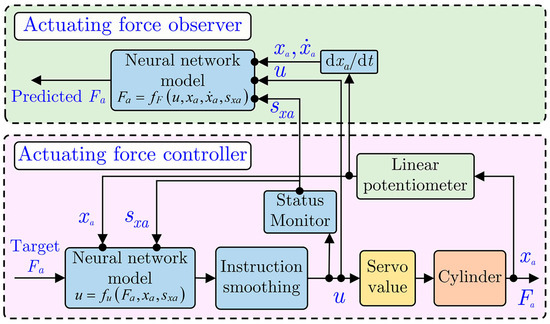 The control strategy of the single-acting pneumatic system is shown in Figure 10. The control system is mainly composed of two modules: the actuating force controller and the actuating force observer. In the actuating force controller, the neural network model of is utilized to predict the target actuating voltage instruction for the servo valve to actuate the pneumatic cylinder in a feedforward approach. During the control process, the actuating force of the pneumatic cylinder can be perceived by the actuating force observer in a sensorless manner.