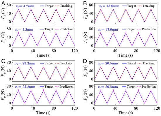 Actuating force tracking and prediction results: (A–D) = 4.2 mm, 13.6 mm, 23.2 mm, and 26.5, respectively.
