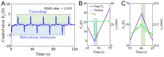 Actuating force tracking error (A) and enlarged view of a typical unloading-to-loading switching (B) and loading-to-unloading switching (C) process at = 23.2 mm.