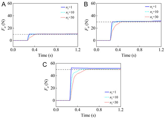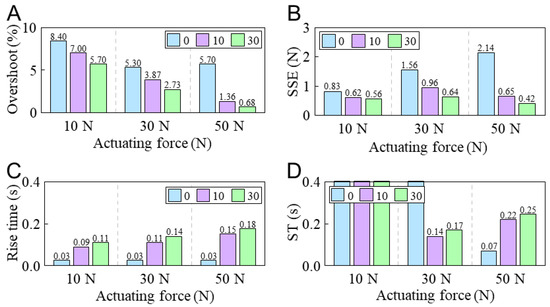 Figure 15C,D reveals that as increases, the rise time and settling time also increase accordingly. For = 50 N, the settling time will increase from 0.07 s to about 0.25 s as increases from 1 to 30.