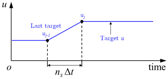 Instruction smoothing of the actuating voltage of the servo valve. The blue solid line shows the process of adjusting actuating voltage u from previous target value uj−1 to new target value uj over time span nsΔt. The black dotted lines mark the start and end points of this adjusting process.