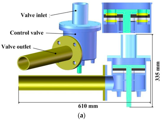 According to the cavity structure of the control valve, Solidworks 2024 software was used to create an original three-dimensional model of the fluid domain inside the control valve, as shown in Figure 3, in which the fluid domain was divided into five parts, namely, inlet channel, outlet channel, upper chamber, middle-lower chamber and middle-lower channel. To ensure unobstructed flow of fluid, the valve inlet was extended by 2 times the pipe diameter, and the outlet is extended by 6 times [21,22].