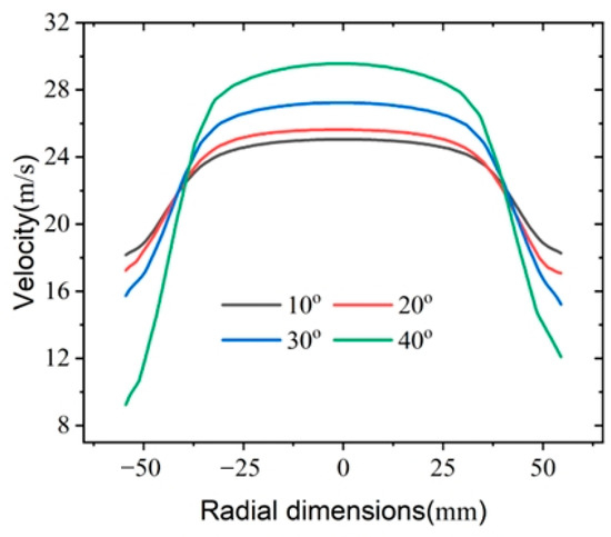 When the opening degree is 100%, in the section H-H, the middle positions of each inlet pipe are considered. The straight lines corresponding to the 10°, 20°, 30° and 40° cones and bell-shaped inlets are Z = 266.315 mm, Z = 148.260 mm, Z = 108.505 mm, Z = 88.325 mm and Z = 44.009 mm, respectively. Their speed and pressure distributions are shown in Figure 13 and Figure 14. At the same height, for the cone tube, the speed and pressure on both sides are relatively small, while the middle speed is large, and the pressure is small. Overall, the speed and pressure change with the radial direction, showing a bell-shaped pattern. Additionally, as the cone angle increases, when the radial size is greater than 36 mm, the speed decreases, and, when the radial size is less than 36 mm, the speed increases. In general, the speed and pressure at the middle position of the bell-shaped entrance are M-shaped, and the change trend of pressure and speed is just the opposite. At the radial size of 46 mm, the pressure reaches its maximum size, and the speed is at its minimum. At the central position and the radial size of 28 mm, local peaks and troughs occur, as shown in Figure 14.