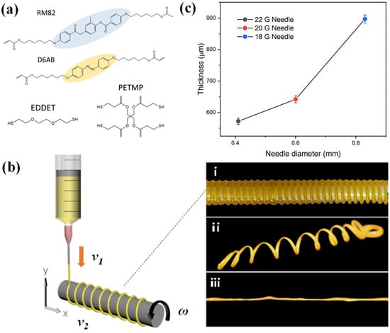 To produce the azobenzene-functionalized LCE coil with a uniform thickness and controllable shape dimension, we developed an extrusion–rolling system as shown in Figure 1b. The LCE ink was extruded through the needle at a speed ν1 controlled by a syringe pump. After dropping onto the collecting mandrel, which rotated at a constant speed ω, the ink was stretched and wound onto the mandrel. Another syringe pump was utilized to push forward the rolling motor at ν2 to enable continuous collection of the LCE ink. The detailed process was provided in the Supplementary Video S1. During the fabrication process, it is important to control the extrusion parameters to obtain a desirable coil-shaped LC oligomer, including ω, ν1, and ν2, and the needle size.