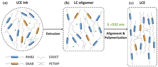 Schematic illustration of the multi-stage crosslinking process for preparation of the LCE coil. (a) In the LCE ink, the LC mesogens exhibited polydomain, and it was non-fully crosslinked. (b) After extruding through the system, the LC mesogens were roughly aligned by the shear stress and formed a coil-shaped LC oligomer. (c) The LC mesogens achieved uniaxial alignment after stretching-induced alignment and photopolymerization by visible light at 532 nm, forming the fully crosslinked LCE coil.