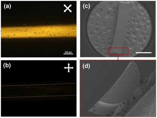 (a,b) POM images of the stretched LCE coil between crossed polarizers. The long axis of the LCE coil is placed at (a) 45°and (b) 0° to the polarizer. (Scale bar = 200 µm) (c,d) SEM images of (c) a small piece of the LCE coil and (d) its cross-section.