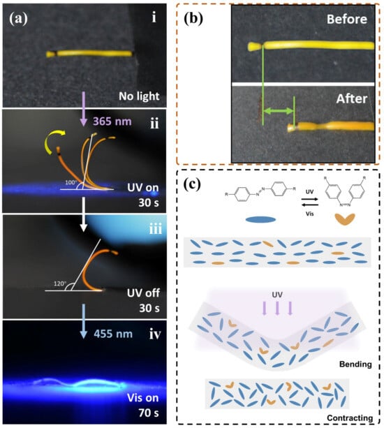 Even after the removal of the UV light, the stretched LCE coil still continued to bend to 120° in 30 s. This bending state remained until the coil was exposed to visible light. This temporarily stable state could be attributed to the remaining stress generated by the cis-isomer [16,51]. Upon visible light illumination (455 nm, 10 mW cm−2), the coil reversed back to a flat state gradually (Figure S6). This is due to photoinduced trans isomerization of the cis azobenzene moieties, resulting in mechanical relaxation and large unbending deformations. Moreover, it was noted that the length of the coil became shorter, and the color changed from light yellow to dark orange after the light illumination. A 30% contraction of the coil in length occurred (Figure 4b). This contraction can be related to the trans-cis isomerization of the azobenzene derivatives inside the LCE coil as well as the photothermal effect, leading to a disturbance of the molecular order of LC mesogens [52,53].