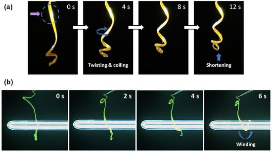 It is expected that the shape deformation could be amplified by using an LCE coil, which was 8 cm long. To investigate the deformation behavior, a UV light (365 nm, 100 mW cm−2) with a spot size of 0.5 cm2 was directed to a section of the coil. As shown in Figure 5a, once it was illuminated by the UV light, it began to twist rapidly. Eventually, it coiled up and became shorter along the longitudinal direction in 12 s. This shape deformation was also due to the conformational change of the azobenzene isomer, inducing anisotropic contraction along the molecular director, thereby converting the absorbed light energy into mechanical work [57,58]. Due to the relatively high azobenzene content, a cis-trans gradient is created throughout the coil, resulting in contraction of the exposed side. The anisotropic contraction at each small piece of the coil was then accumulated and converted to the macroscopic contraction of the entire coil, thereby leading to the coiling behavior.