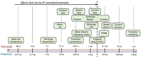 As a first step, it is important to summarize the orders of magnitude of the various dynamics that are present in EMAs, as illustrated in Figure 2. A second step consists of linking the project needs to the effects to be considered in the RT models. In such a way, combining these two steps enables the designer to specify or select the relevant hardware and simulation environment. At the aircraft level, it is not required to simulate in detail the switching of the inverter transistors and the motor parameters that depend on the actual winding currents and electric angle. In this case, there is no particular need to use FPGA, and a cheaper and more flexible CPU implementation is generally acceptable.