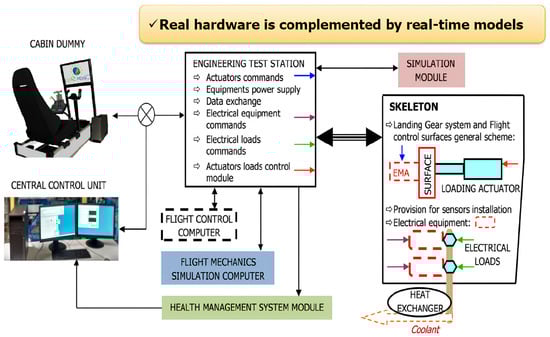 The EMA RT models, the objective of the present paper, have been developed in the frame of the Astib CleanSky2 program, which aims to develop innovative aircraft demonstrator platforms (IADPs) for regional aircraft [34,35]. Being hybrid, the aircraft integration test rig, schematized in Figure 3, is itself innovative: it combines a real iron bird for the right wing and a virtual one for the left wing [7,36]. The real-time models of the actuators are implemented in the simulation module, while the flight mechanics is simulated in a dedicated simulation computer. Each simulated actuator model also outputs the power drawn by the actuator from the electrical DC source, which is used to command the piloted real electrical loads.