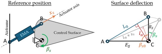 The direct-drive, linear EMAs to be modeled have a constant DC voltage supply and use a 3-phase PMSM with sinusoidal back-EMF and inner rotor with surface-mounted permanent magnets and an electromechanical normally closed brake, Figure 4. This typology is coherent with the electric motors usually employed in aircraft control surface actuation.