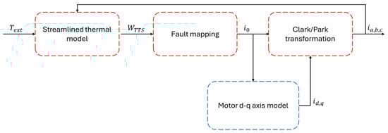 Version 12 of the model was the first to incorporate the degradation modeling previously described in Section 5.6. Models V15 to V21 are simply the last most updated version of the model (V14), with one of the considered degradations activated. Version 22 contains all degradations activated simultaneously. It is interesting to note that all degradations introduce a negligible increase in computational burden, except for the electric motor turn-to-turn fault (V17), which is the main contributor to the TET increase in V22. In fact, the electric motor turn-to-turn short (EMTTS) fault is the most computationally demanding degradation as, when activated, it involves two additional integrators and Clarke/Park transformations. On the other hand, other degradations’ implementations exclude some parts of the block diagram or, alternatively, introduce very simple operations, which do not introduce substantial computational overhead.