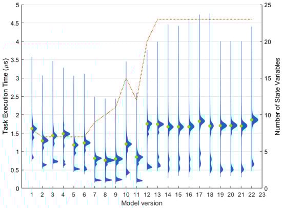The evolution of the task execution time distributions (blue) and number of state variables (red) with the different versions of the model.