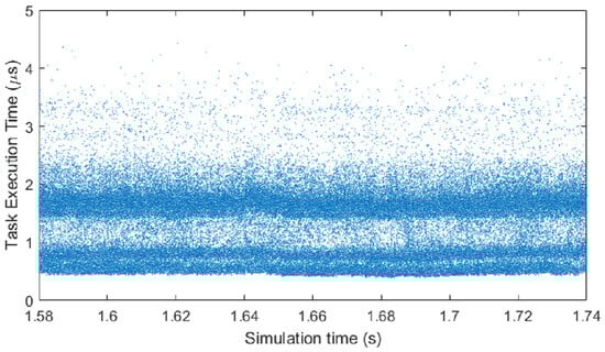 An example of the task execution time dispersion throughout the computation of a single simulation where each dot corresponds to the computation of a single time step of the simulated model.