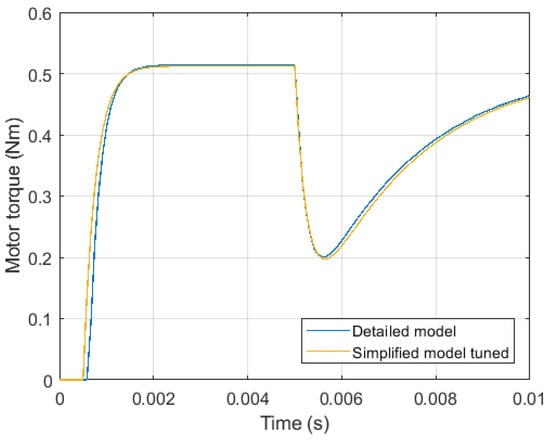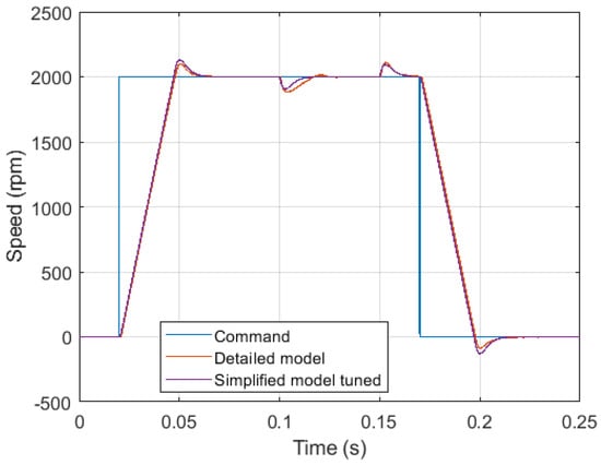 Subsequently, the model was subjected to the speed loop testing phase, which involved a rotor speed step demand of 2000 rpm from 20 ms to 170 ms. To test the disturbance rejection of the regulator, a disturbance torque step of 2.5 Nm was applied on the motor shaft from 100 ms to 150 ms. The results of this second phase of parameter tuning are represented in Figure 19, from which it is possible to observe the good correspondence between the high-fidelity reference model response and the speed obtained from the proposed model. The results consider both the already tuned current loop and the speed loop.