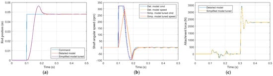 Finally, the complete three-level nested structure of the actuator controller was tested during the last phase, involving the tuning of the rod position loop parameters. To this aim, a position step command of 0.5 mm was sent as input starting at 0.1 s, while a disturbance torque of 160 Nm was applied at 0.3 s on the aerodynamic surface. Also, in this case, the RT model succeeded in replicating the rod position of the more advanced model, as depicted in Figure 20a. Figure 20b illustrates the controller’s internal signals, i.e., the speed command coming from the position loop output and the actual rotor speed. Eventually, Figure 20c shows the effect of the disturbance torque on the aerodynamic surface: the external torque translates to an equivalent linear force on the rod end connection by means of the variable lever arm. The external force introduces minimal displacement variation on the actuator rod, demonstrating its ability to reject disturbances. The oscillations introduced by the torque step can, however, be slightly observed in the speed signal of Figure 20b.