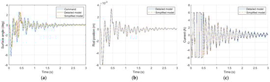 A comparison of the high-fidelity and the proposed simplified model to a position loop command: surface angle (a), rod position (b), and motor current (c).