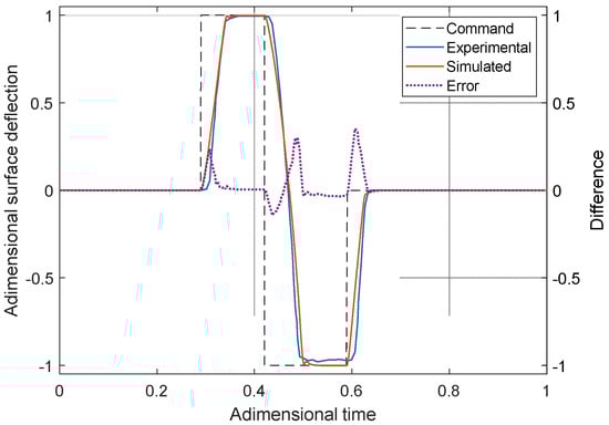 The tuned model was finally compared with an experimental response of the actual actuator provided by the research program partners. Depicted in Figure 22, the provided data included only the surface deflection when a full stroke step command is demanded to the controller in both directions. The RT model shows a good correlation with the experimental data, validating its accuracy and reliability in replicating the actuator’s dynamic response and allowing for its implementation on the iron bird framework.