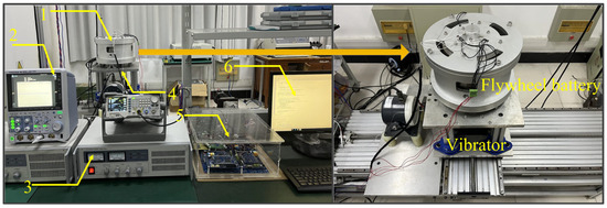 Vibration exciter experimental platform diagram. 1. Flywheel battery; 2. Oscilloscope; 3. Power supply; 4. Vibration exciter; 5. Control box; 6. Upper computer.