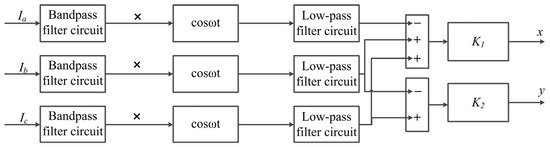 In Equation (12), K = 4Ud/μ0N2Sπω. According to Equation (12), the change in phase current of three-phase coil reflects the change of rotor air gap. The three-phase current is demodulated and filtered by the signal demodulation circuit. A DC signal proportional to the rotor displacement signal can be obtained. The displacement signal detection circuit uses an analog circuit to realize the phase current band-pass filtering, demodulation and low-pass filtering. The displacement of the rotor from the balanced position in the magnetic bearing system is obtained indirectly and provided to the input end of the controller. The rotor is stably suspended in the equilibrium position after the operation of the relevant control algorithm. Its detection circuit structure block diagram is shown in Figure 5. In Figure 5, K1 = 4/3K and K2 = 4/√3K.