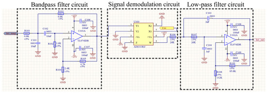 The displacement self-sensing circuit adopted in this paper is shown in Figure 6. It consists of a band-pass filter circuit, a signal demodulation circuit, and a low-pass filter circuit. When the rotor in the flywheel battery system deviates from its equilibrium position, it causes changes in the three-phase current of the magnetic bearing. This displacement self-sensing circuit extracts the current signal to indirectly obtain the displacement of the rotor deviation, which is then fed back to the controller. After processing by the control algorithm, the output ensures the stable levitation of the rotor at the equilibrium position. The following sections will provide a detailed explanation of the three parts of the circuit.