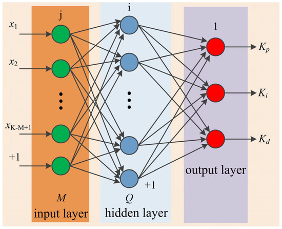 Let the BP neural network for PID control be a three-layer BP network; its structure is shown in Figure 8. There are M input nodes, Q hidden layer nodes, and three output nodes. Enter the number of nodes corresponding to the selected system running status. For example, the input and output of the system, at different times, should be normalized if necessary. The output nodes correspond to the three adjustable parameters, kp, ki, and kd, of the PID controller, respectively. Since kp, ki, and kd cannot be negative values, the activation function of neurons in the output layer is a non-negative Sigmoid function. The activation function of hidden layer neurons can be a Sigmoid function with positive and negative symmetry. The S-type function is chosen as the activation function for BP network neurons because it is continuously differentiable and more similar to the signal output form of biological neurons.