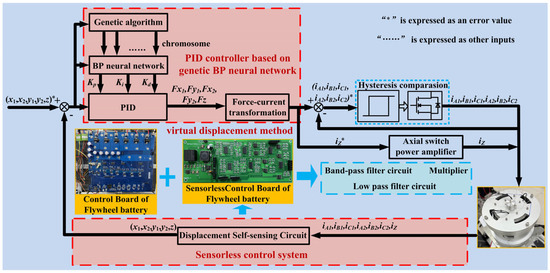In conclusion, this study takes a multi-functional air-gap vehicle-mounted flywheel battery with a special structure as the controlled object and proposes a sensorless technology based on a genetic BP neural network PID controller. This algorithm aims to solve the following three key problems: (1) How to explore the vibration mechanism of the flywheel battery under continuous road disturbance. (2) How to achieve a low-cost and high-performance sensorless control system for the vehicle-mounted flywheel battery. (3) How to determine the structural parameters of the genetic BP neural network model by means of offline training. To solve the above three key problems, this article first analyzes the principle of traditional sensorless technology and designs the hardware circuit of the displacement self-detection circuit. Secondly, the technology of the genetic BP neural network PID controller is proposed and analyzed in detail. Finally, taking the road condition of continuous speed bumps as an example, simulation and experimental verification were carried out.