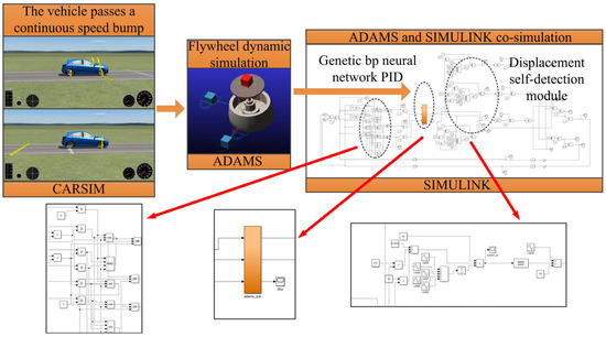 In order to obtain the actual external disturbance of vehicle-mounted flywheel battery under the coupling excitation of vehicle and road conditions in actual bumpy road conditions. Therefore, the most classic continuous speed strip road conditions were selected in the vehicle simulation software CARSIM2020.0 for simulation. Set the speed at which the speed bump is 10 km/h, with the distance between the two speed bumps set at 4.5 m and the height of the speed bump set at 7 cm. The simulation vehicle selected the most common Class A vehicle in daily life, with a body length of 4.3 m. The specific simulation data is shown in Table 1. Through the CARSIM vehicle simulation software, the longitudinal acceleration, lateral acceleration, and vertical acceleration data of vehicles under bumpy road conditions can be obtained. After these acceleration data are obtained, the acceleration data of the corresponding direction of the body are respectively imported into the upward drive of the flywheel dynamics model in the dynamics simulation software ADAMS. The dynamic response of the flywheel battery rotor is obtained through simulation by setting the translation drive, and the dynamic performance of the flywheel rotor directly affected by the vehicle is obtained. When the flywheel rotor is disturbed by the coupling excitation of vehicle-speed belt road conditions, the rotor will shift in the equilibrium position. The real-time current signal after disturbance can be sampled by the displacement self-detection module. The position deviation signal is obtained by converting the current signal into the displacement signal and comparing it with the equilibrium position reference signal. The position error signal is sent to the PID controller optimized by the genetic BP neural network for processing. This part of the simulation adopts ADAMS and SIMULINK co-simulation. The entire simulation process is shown in Figure 11.