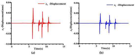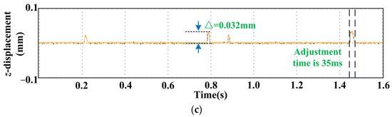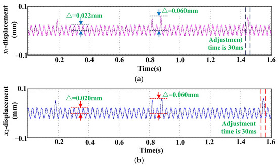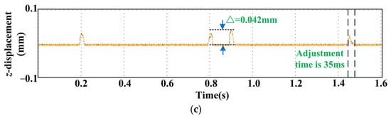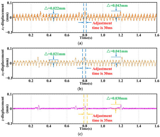As shown in Figure 16. From the perspective of radial, the rotor produces four large offsets in the direction of x1. The maximum peak is about 0.060 mm, which is quickly adjusted to about 0.022 mm. From the perspective of torsion, the rotor also produces four large offsets in the x2 direction. The maximum peak is also about 0.060 mm, which is quickly adjusted to about 0.020 mm. From the perspective of axial, the rotor produces four large offsets in the same z direction. The maximum peak value is about 0.042 mm, and it quickly returns to stability. In terms of transient response, the peak time of the three response curves is 0.2 s, the adjustment time of the radial response curve and the torsional response curve is 30 ms, and the adjustment time of the axial response curve is 35 ms.