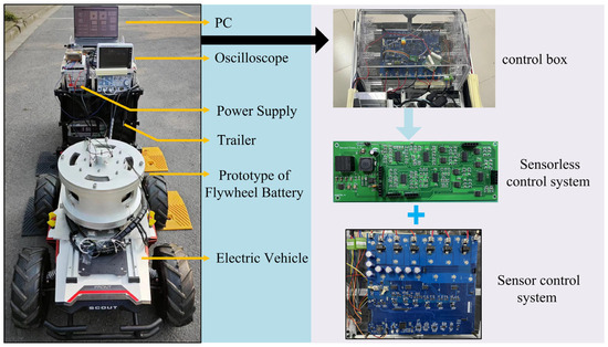 The magnetic suspension flywheel battery, also known as flywheel energy storage system. As a green physical battery, it breaks through the limitations of traditional chemical batteries [1]. It exhibits advantages such as high energy-storage conversion efficiency, long lifespan, absence of pollution, and short charging time [2]. The application of the flywheel battery to the field of electric vehicles can not only extend the life of the prime power battery but also improve the power performance and endurance of electric vehicles [3,4]. At present, the control system of the vehicle-mounted flywheel battery is mainly based on a sensor control system [5]. This control system relies on the displacement sensor to feedback the rotor changes. The position error data of the flywheel rotor is transmitted to the controller, and then the controller adjusts the magnetic suspension bearing to stabilize the flywheel rotor. At present, there are three common displacement sensors: eddy current, capacitive, and photoelectric. However, sensor-based control systems are greatly affected by the environment, especially when the vehicle is driving on some of the more complex road conditions [6]. When the sensor in the sensing control system fails, it will cause errors in the feedback data. These errors will greatly reduce the control effect of the entire control system. Secondly, the price of the sensor is expensive, and the installation is difficult, so the reliability is greatly reduced. In order to overcome the high cost of sensors in the sensor control system, the installation environment is affected by limiting factors such as the influence of magnetic bearing structure. The advent of sensorless control systems allows for reliable control at low cost without the need to install sensors [7]. This technology effectively avoids feedback errors of the sensor in the onboard flywheel battery system in more complex road conditions. It not only reduces the cost of the entire control system but also further enhances the reliability of the flywheel battery [8,9].