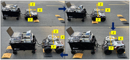 Taking the most common continuous speed bump road conditions as an example, the experimental car conducted three consecutive speed bump experiments. The first experimental car was equipped with a sensor control system based on a traditional PID controller. The second experimental car was equipped with a sensorless control system based on a traditional PID controller. The third experimental car was equipped with a sensorless control system based on a genetic BP neural network PID controller. An oscilloscope is used to compare the flywheel rotor offset, and then the two control effects were compared. First, set the experimental conditions: the mobile vehicle-mounted flywheel battery test platform passes through a continuous speed bump with a height of 7 cm at a speed of 5 m/s. The driving direction of the vehicle is the x-direction of the displacement coordinate axis of the vehicle-mounted flywheel rotor. The length of the experimental car is 1.2 m. When the experimental car overpasses the speed reduction belts 1 and 2, there are two vibrations of the front wheel and the rear wheel, respectively. The two speed bumps have four vibrations. Therefore, in order to facilitate the observation of experimental waveforms, the interval between the two speed belts is set at 1.5 m. The process of the experimental car passing the continuous speed bump is shown in Figure 14.