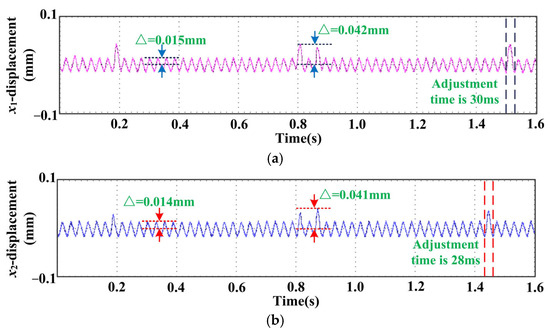The waveform of rotor offset obtained by simulation: (a) The radial offset of the rotor under the control of the conventional PID controller. (b) The radial offset of rotor under the control of the BP neural network PID controller.