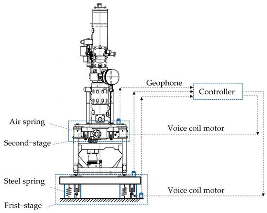The majority of commercial high-precision instruments are currently integrated with passive vibration isolation components [1,2] to isolate the vibration effects from the environment. However, the introduction of these components undoubtedly increases the system’s sensitivity to low-frequency vibrations. Furthermore, with the continuous development of the semiconductor industry and the resolution of precision instruments reaching the sub-nanometer scale or even higher, passive vibration isolation and its improved forms [3], as well as semi-active vibration control [4,5], are unable to achieve the vibration levels required by precision instruments [6].