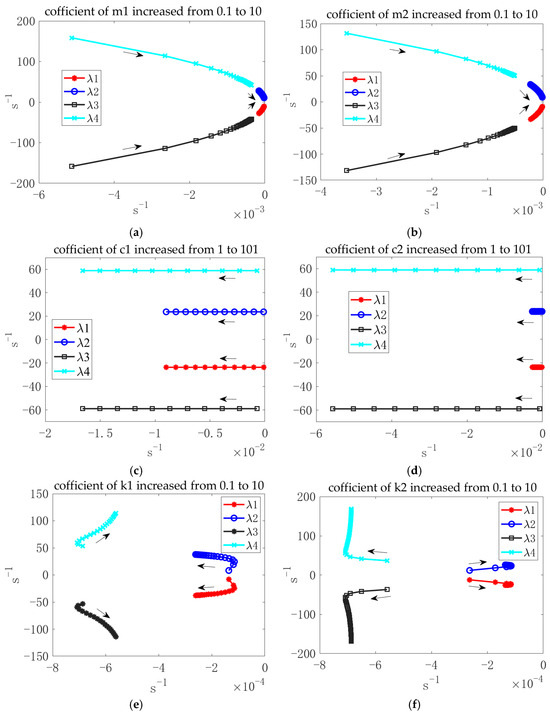 Figure 3 depicts the eigenvalue distribution of the DCSMS, obtained through a MATLAB simulation under the influence of varying parameters. The variation range for the multiplication coefficient was set to [0.1, 10] or [1, 101], considering the system’s practical feasibility. Figure 3a–f illustrate the distributions of the characteristic roots , , , and related to the variation in , , , , and , , and the arrows indicate the direction of the parameter changes.