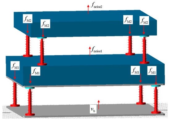 A diagrammatic sketch of the DCSMS is shown in Figure 2, where , , and represent the absolute velocities of the ground stage, first stage, and second stage, respectively. Neglecting the influence of gravity and the relative equilibrium force, the first-stage load () is subject to the following four forces: the basic elastic force (), the basic damping force (), the upper elastic force (), and the upper damping force (). In contrast, the second-stage load () is influenced solely by and .