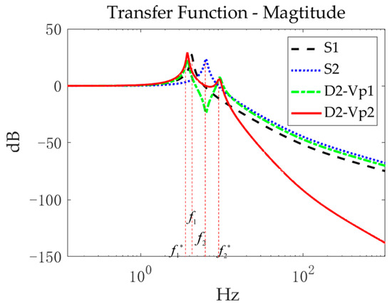 The separate velocity transmissibility curves of the SLSMS are represented by the black and blue lines shown in Figure 5, with the corresponding resonance frequencies and , respectively. Following cascading, the second-stage velocity transfer function curve (the red solid line) exhibits the same characteristic roots ( and ) as those of the first-stage velocity transmissibility (the green dot-dashed line). Furthermore, the numerical value of the red solid line is equal to the sum of the numerical values of the blue dotted and green dashed lines.