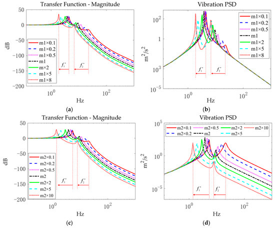 Variation in the second-stage load mass () produced FRC and PSD curves in Figure 6c,d that are similar to those shown in Figure 6a,b. The difference between them is that starts from the initial value () and continues to decrease with as increases, and finally, gradually approaches the calculated value of 7.833 Hz. According to the comparison of Figure 6b,d, determines the PSD of in the high-frequency range, in contrast to . and throughout the entire variation process. When increases to 10 times its initial value, the simulated system encounters an overturning problem.